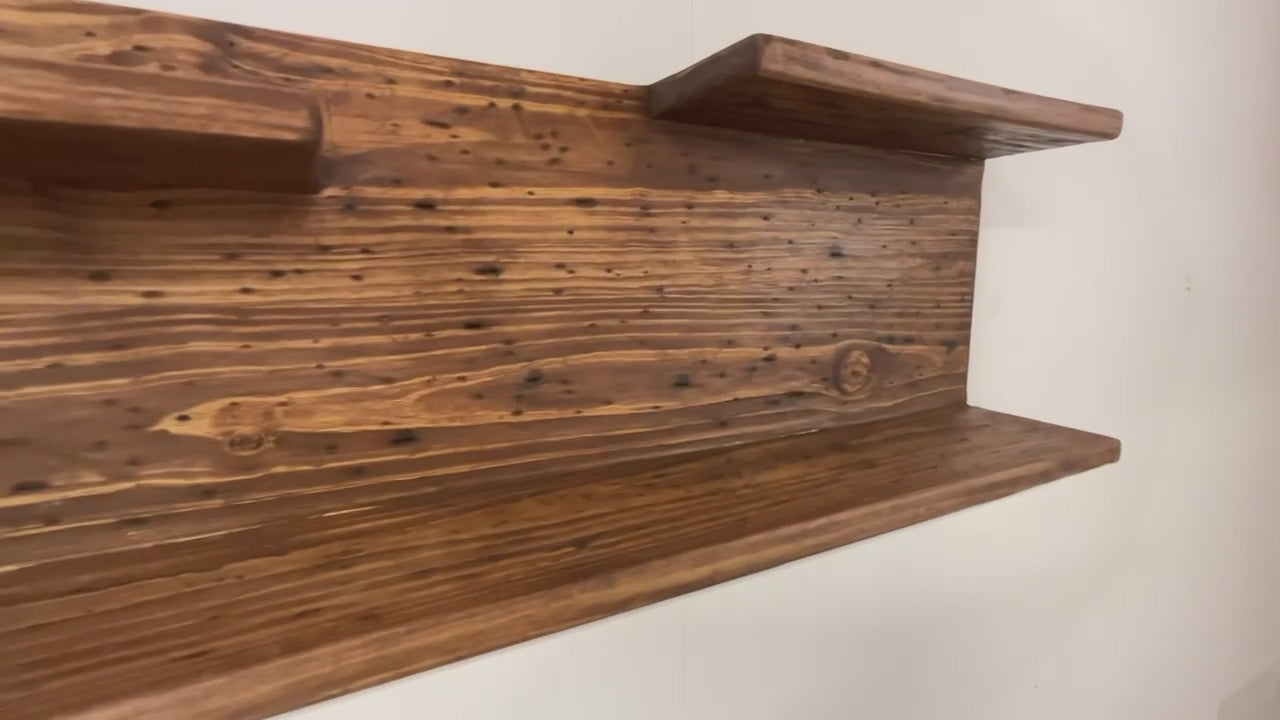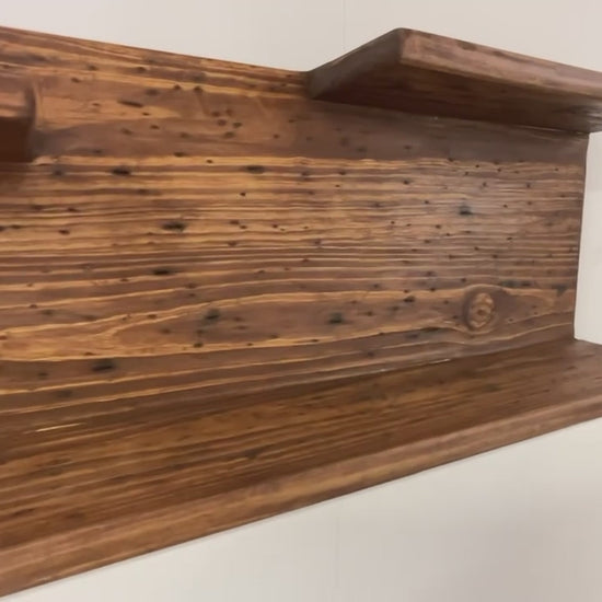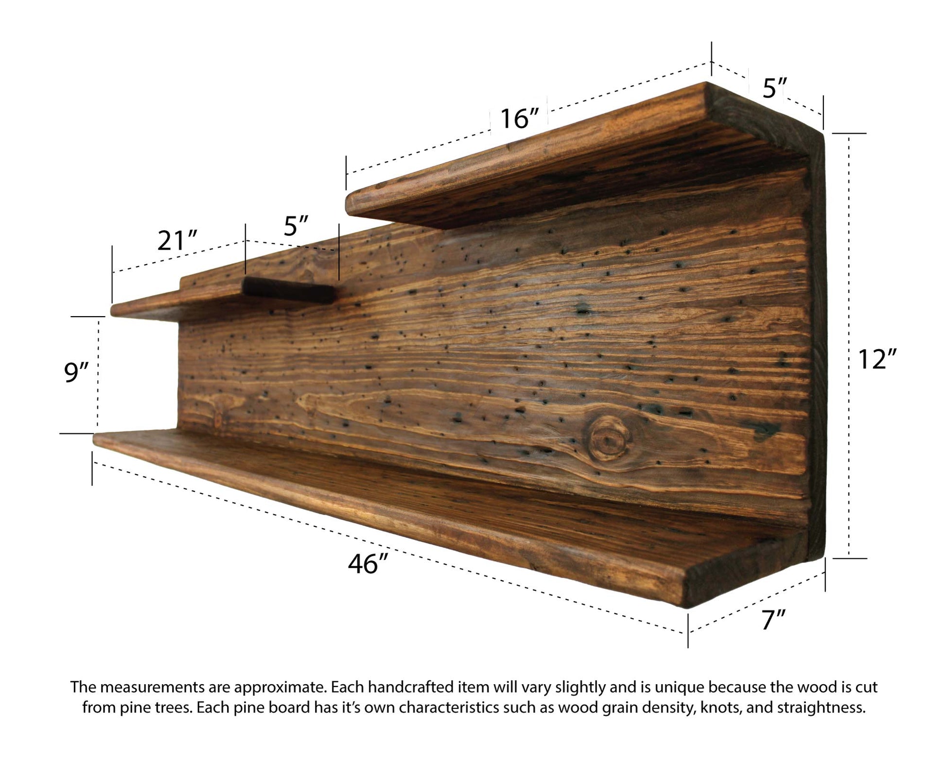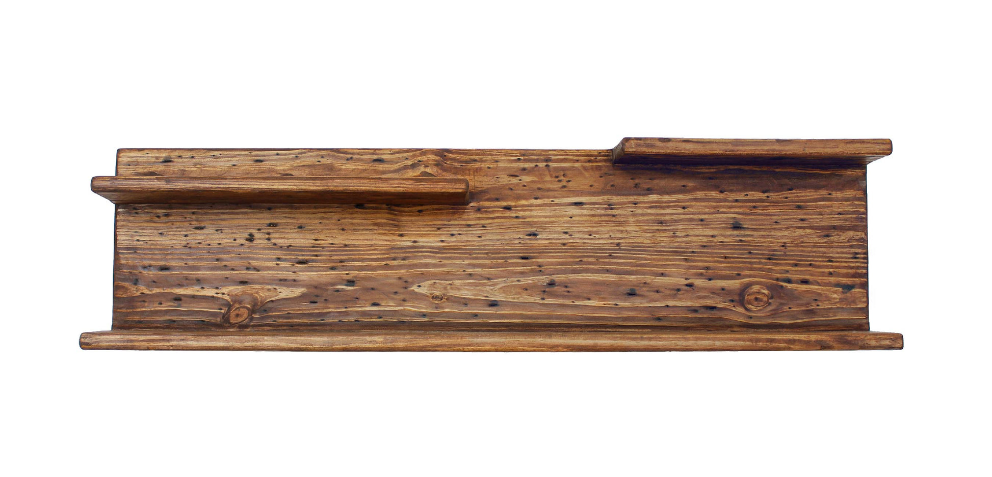 Bring timeless rustic charm to your space with these handcrafted split-level wooden wall shelves, made by hand-weathering solid pine wood for a beautifully aged rustic look. Choose from 24", 36" or 46" wide, this farmhouse-style shelf is the perfect blend of function and character, offering a stunning way to display plants, books, collectibles, antiques, family heirlooms, vintage decor or even towels and toilet paper in the bathroom.