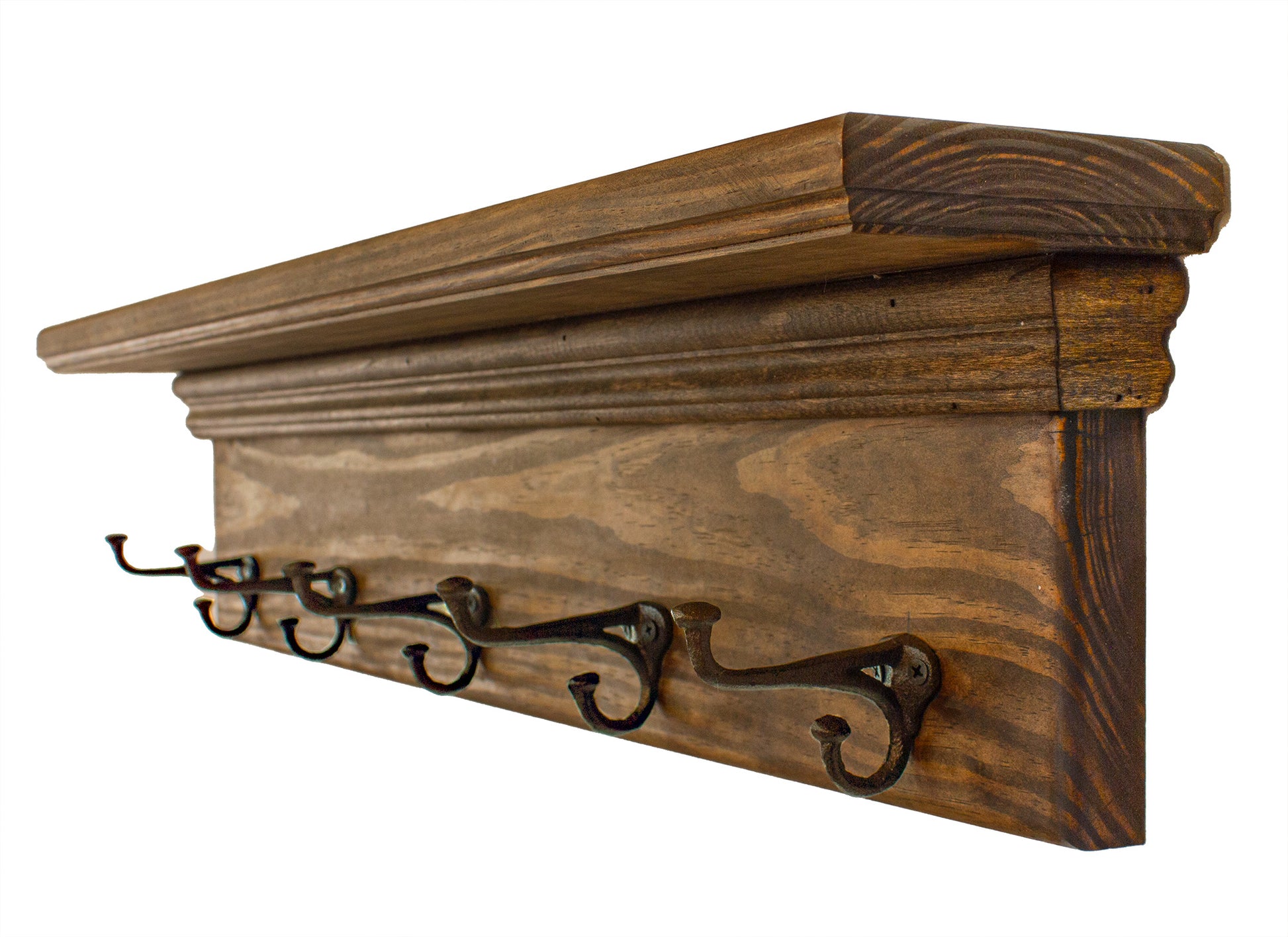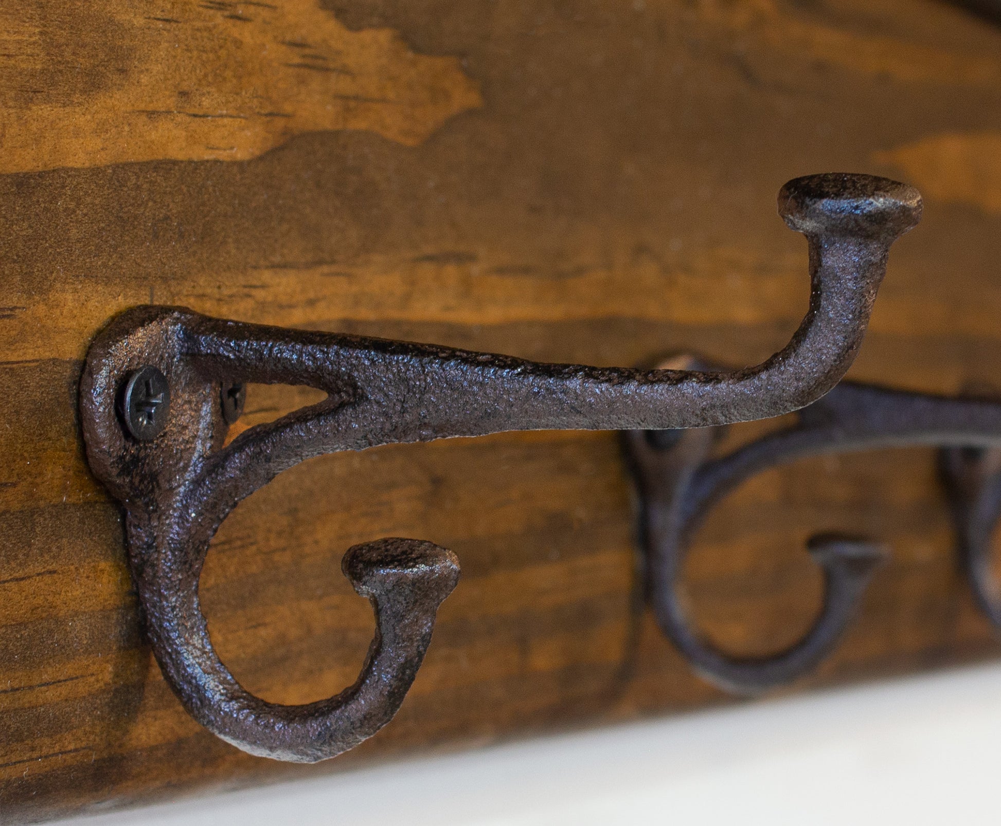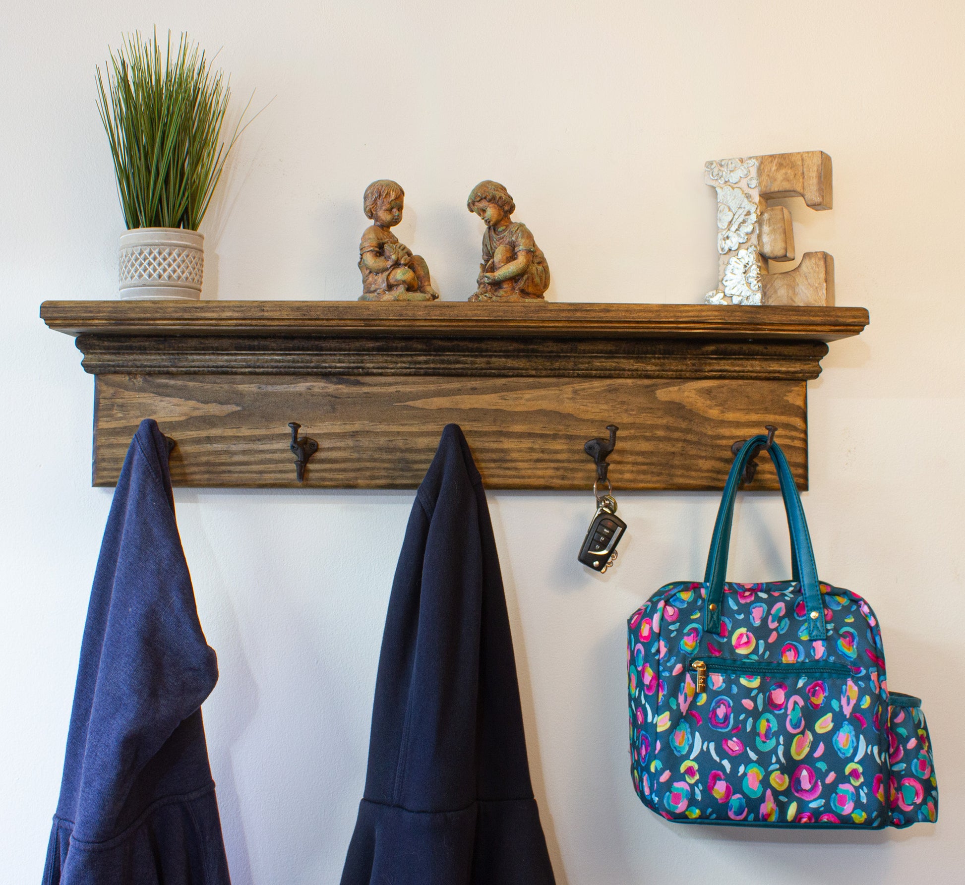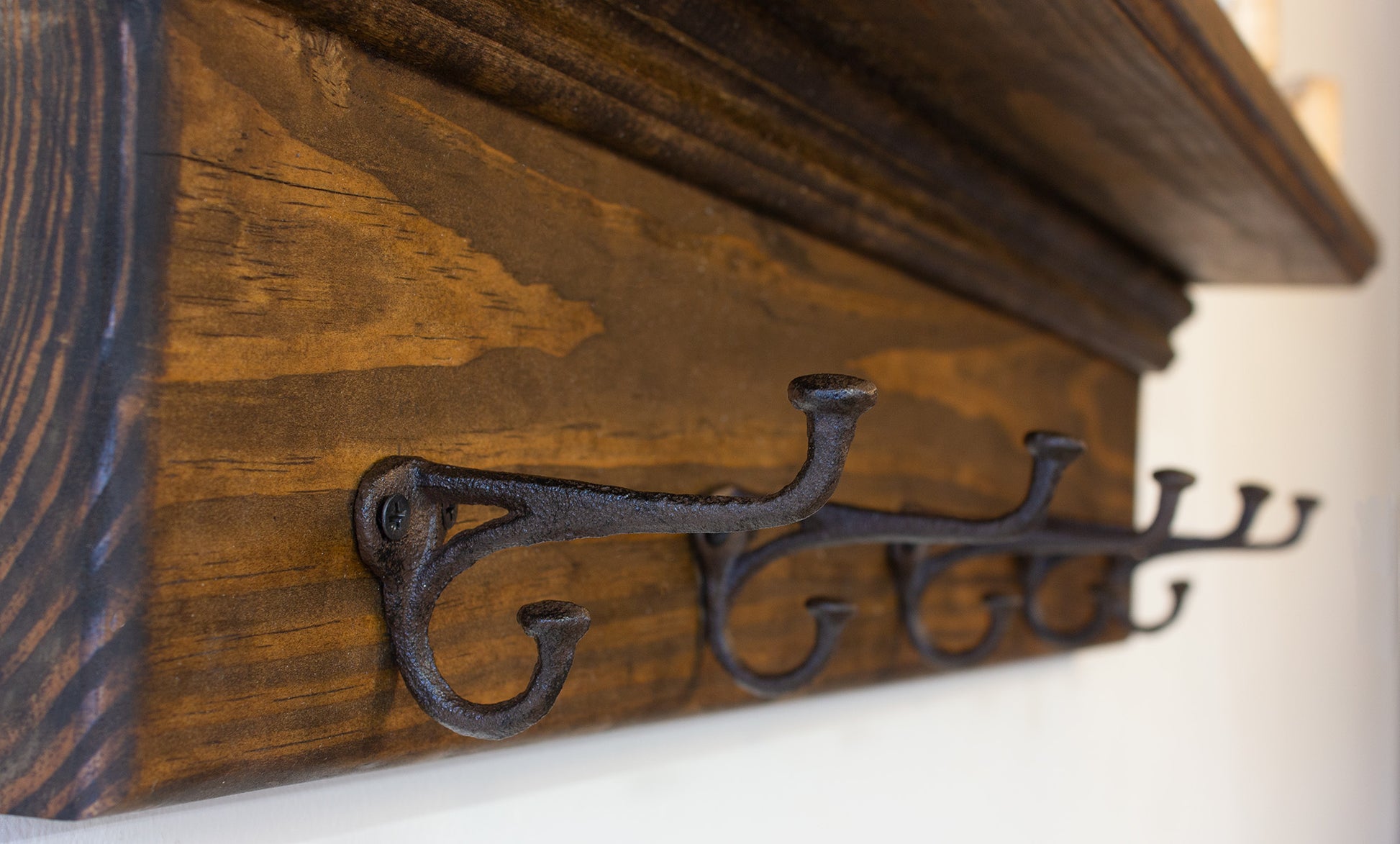 The metal hooks have a nail head which looks fantastic against the wood grain backboard and top shelf. It is made from locally sourced wood and stained in your choice of color. You can make a special request to customize the length, number of hooks, and color. This product is handcrafted in our USA workshop ready to install, complete with instructions and mounting hardware.